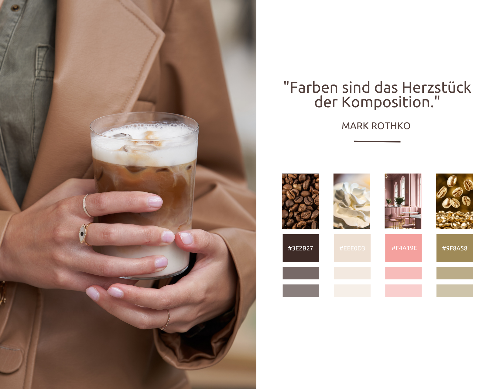 Das von uns entwickelte Corporate Design schafft eine Atmosphäre der Raffinesse und Eleganz. Edle Materialien wie Marmor und Leder sowie warme Beleuchtung prägen das luxuriöse Ambiente. Die Farbpalette aus warmen Brauntönen, Creme und zartem Altrosa, ergänzt durch goldene Akzente, sorgt für eine stilvolle und entspannende Auszeit. Besonders hervorzuheben ist das Corporate Design, das ein innovatives Hidden Logo beinhaltet: Eine subtile Kaffeebohne ist im Buchstaben „G“ versteckt, was geschickt die Verbindung zum Kaffee herstellt. Dieses Detail betont die Exklusivität und den hohen Anspruch der Marke. Elegante Schriftarten und dezente grafische Elemente unterstreichen die stilvolle Ausstrahlung und sorgen für einen hohen Wiedererkennungswert.